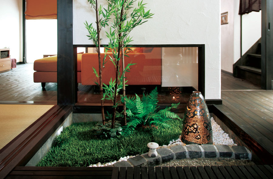 奥へと伸びる通り土間から坪庭がお出迎え。